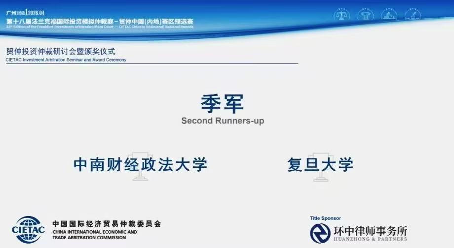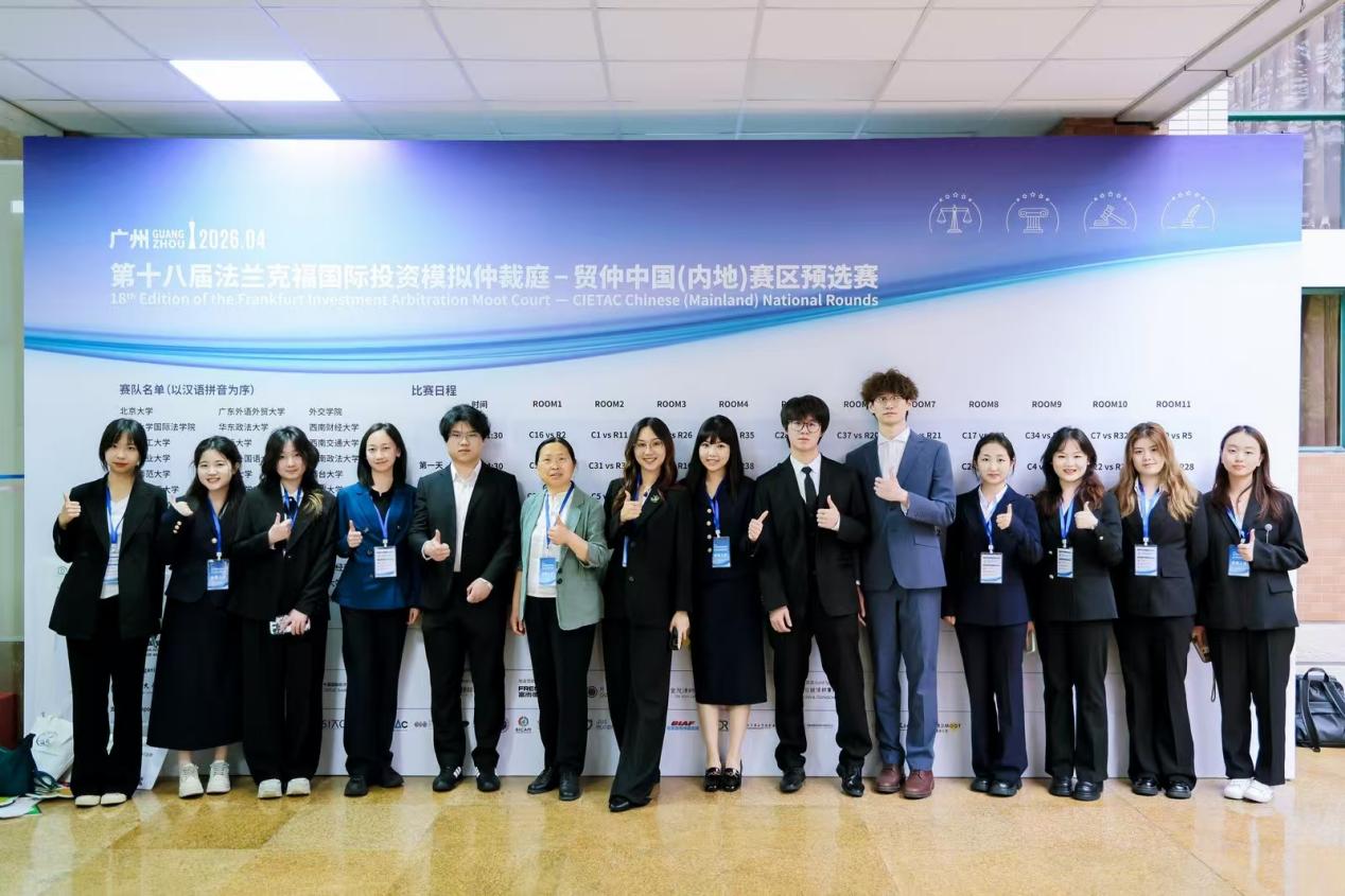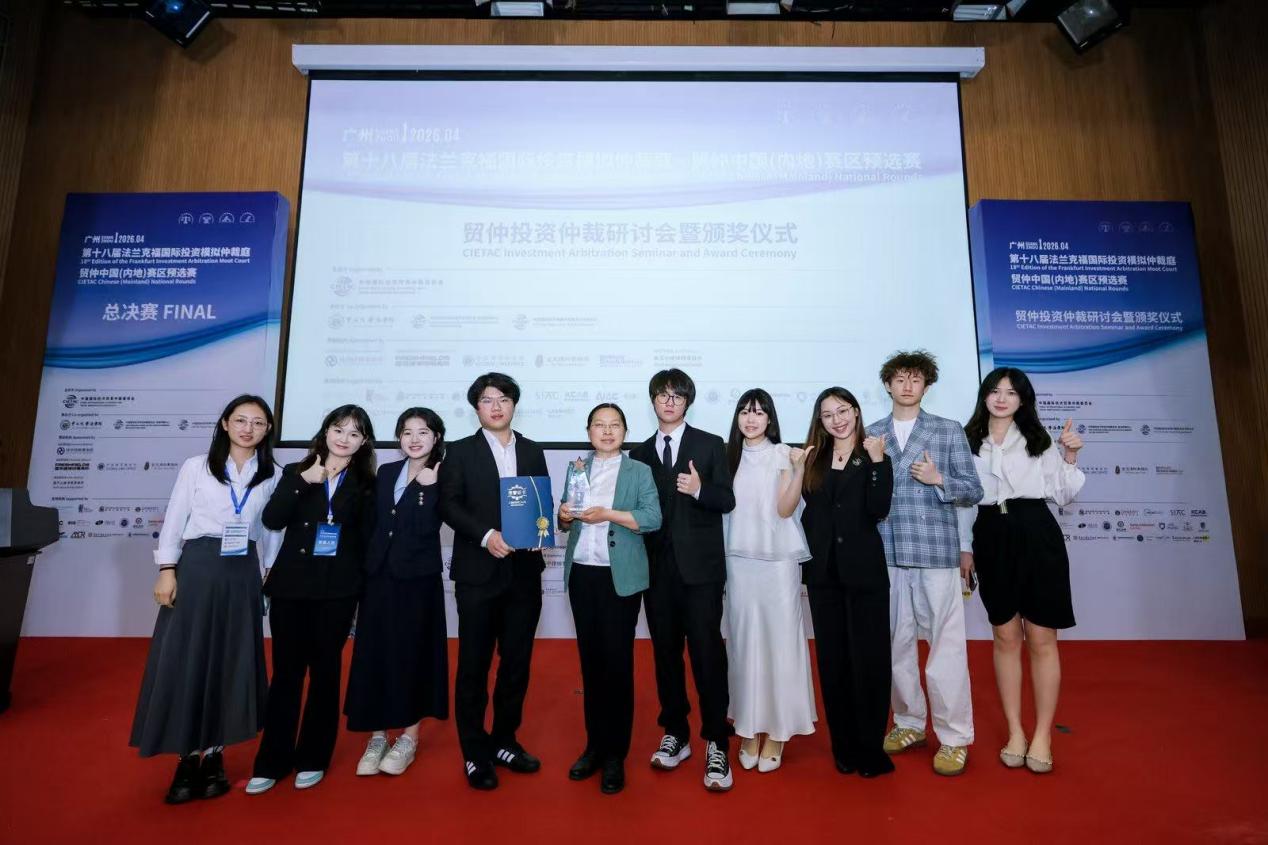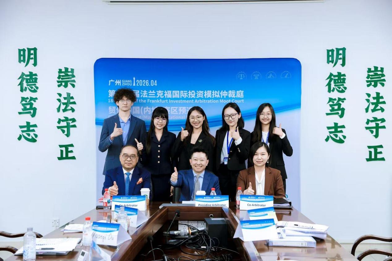 2026年4月8日至12日,由中国国际经济贸易仲裁委员会主办,贸仲香港仲裁中心、贸仲华南分会及中山大学法学院联合承办的第十八届法兰克福国际投资模拟仲裁庭中国(内地)赛区预选赛,在中山大学广州校区东校园圆满落幕。来自北京大学、对外经济贸易大学、复旦大学、中山大学等全国39支顶尖高校队伍同台竞技,经过四天69场激烈角逐,我校代表队凭借扎实的专业功底、出色的英文庭辩能力与默契的团队协作,在循环赛中以总分全国第一的佳绩跻身半决赛,最终荣膺中国赛区季军,成功晋级德国法兰克福全球国际赛,创下我校参加此项比赛以来的历史最好成绩。其中,杜沅锜同学斩获半决赛“最佳辩手”,路馥源、肖柏村同学分获循环赛“最佳辩手”,林嘉瑜同学获评“团队贡献奖”,用实力彰显了中南大法学学子的国际风采。