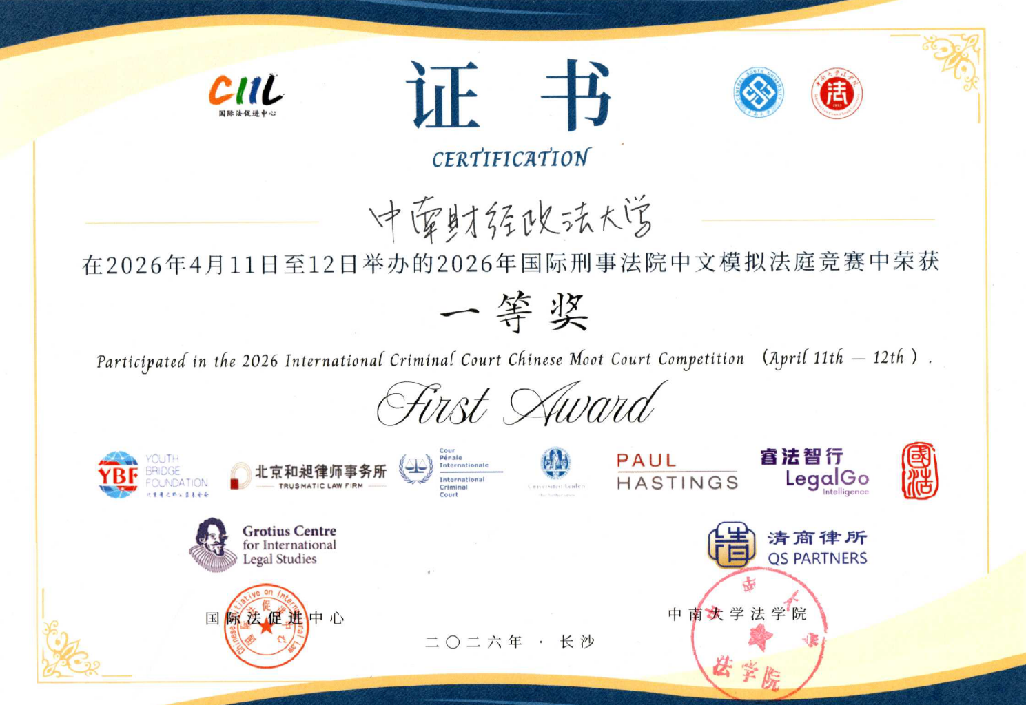 2026年4月10日至4月12日,由国际法促进中心和中南大学法学院联合举办的2026年国际刑事法院中文模拟法庭竞赛(即“ICC中文赛”)在湖南长沙举行。作为国际法领域的重要赛事之一,本届竞赛由84名国际法学界与实务界权威专家担任评审法官,吸引了北京大学、清华大学、吉林大学、中国政法大学、香港大学、澳门大学、东吴大学等来自全国海峡两岸暨香港、澳门的130支高校代表队参加,参赛队伍数量创历史新高。