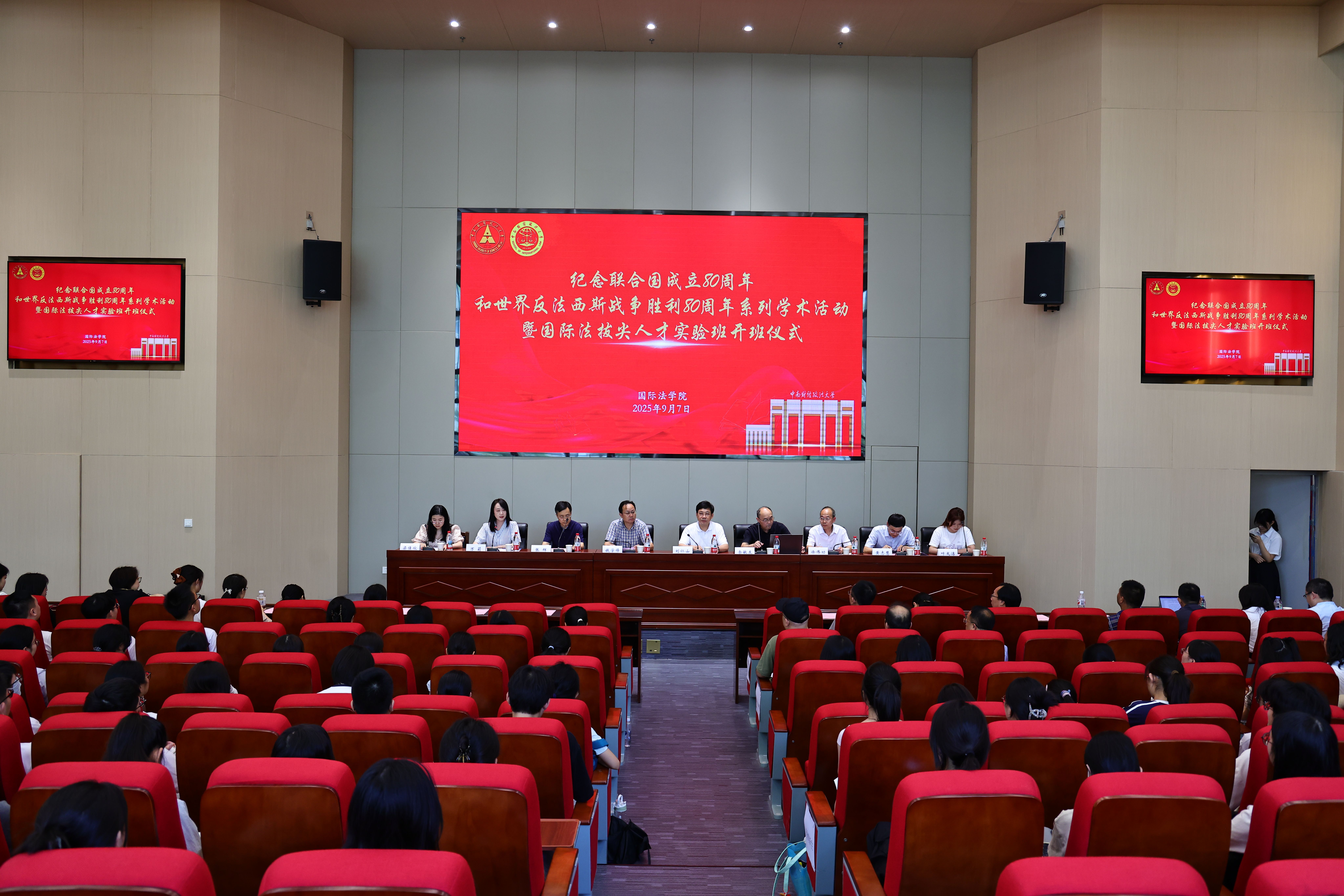 为弘扬伟大抗战精神,铭记光辉历程,从伟大胜利中汲取前行智慧和力量,并响应国家加强涉外法治人才培养的号召,打造具有中国特色和国际视野的涉外法治人才培养高地,9 月 7 日下午,纪念联合国成立 80 周年和世界反法西斯战争胜利 80 周年系列学术活动暨国际法拔尖人才实验班开班仪式,在中南财经政法大学法科大楼一楼报告厅成功举办。