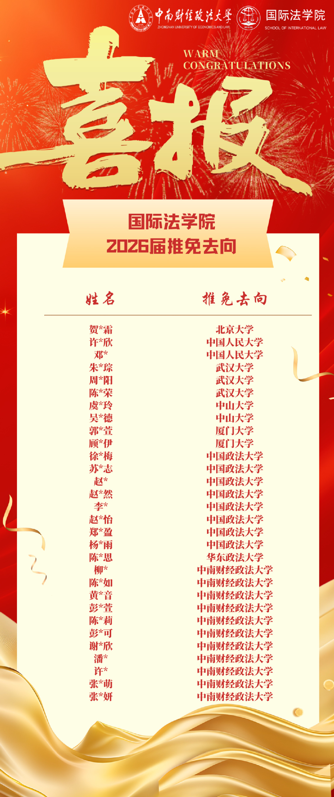 春华秋实,硕果盈枝。这份来之不易的推免资格,见证了国际法学子无数个日夜的勤勉与执着。愿你们带着这份荣耀与师长的嘱托,奔赴下一场山海,母校永远是你们坚强的后盾!