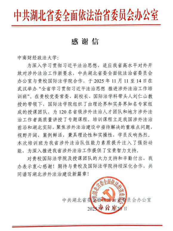 本次培训对推进全省涉外法治体系和能力建设、护航中部地区崛起重要战略支点建设具有重要意义。培训结束后,中共湖北省委全面依法治省委员会办公室专门致信中南财经政法大学,感谢我院及其授课团队对培训工作的大力支持和辛勤付出,期待与我院在涉外法治领域继续深化合作,为我省涉外法治建设谱写新篇章。