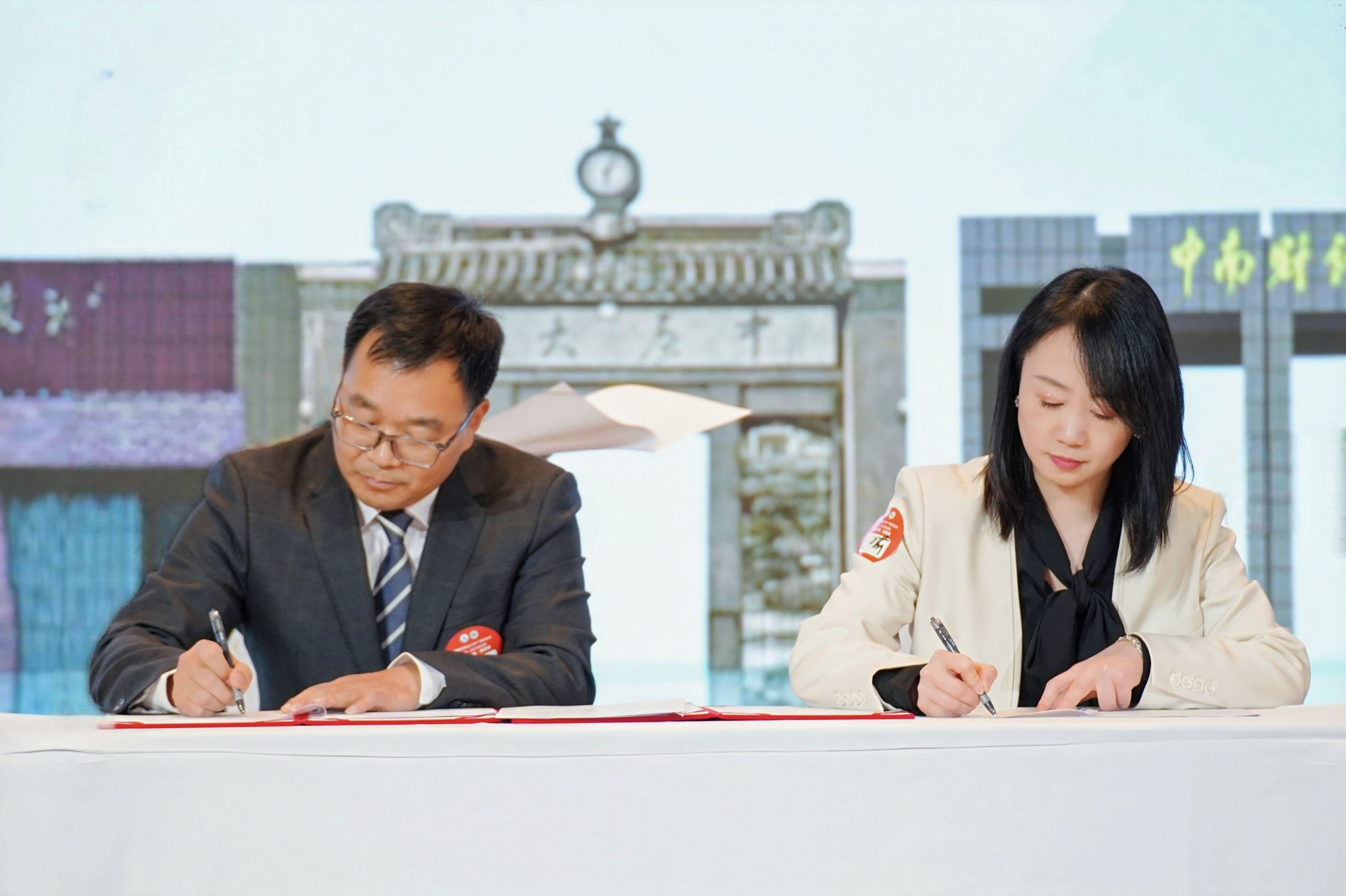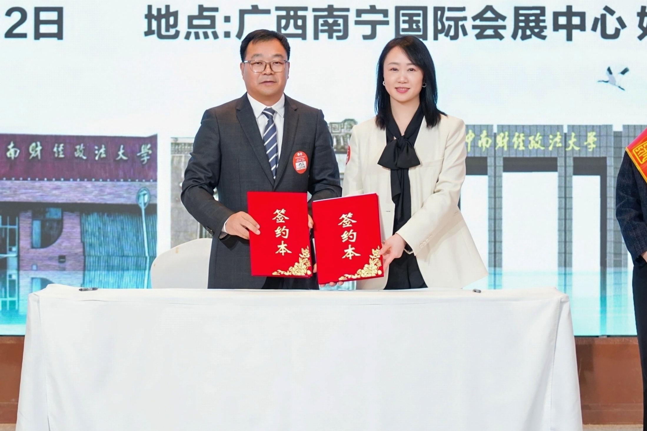 国际法学院党委书记万莉与广西沃诚律师事务所主任、广西校友会执行会长邓超校友代表双方签署协议。