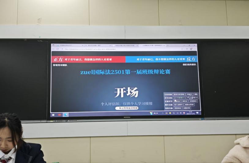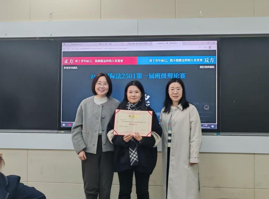 11月18日,国际法2501班级辩论赛于文波智慧教室108成功举行。本次活动特邀董星仙辅导员及梁佳欣老师作为评委,旨在响应新时代青年核心素养培育要求,为同学们提供一个锤炼逻辑思维、展现语言艺术的平台,让思想深度与青春活力在班级协作中完美交融。
