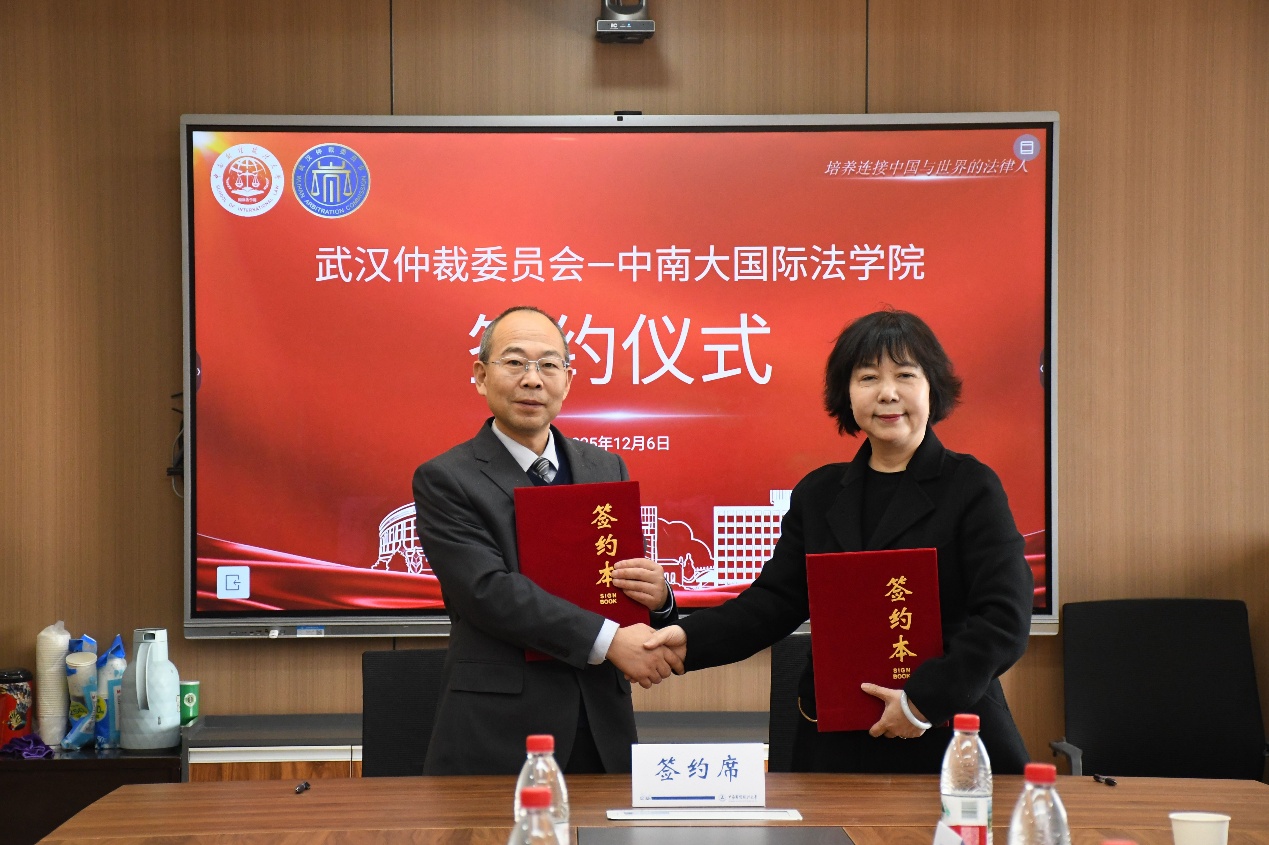 2025年12月6日,中南财经政法大学国际法学院——武汉仲裁委员会签约仪式于文治楼八楼815会议室举行。武汉仲裁委员会办公室党组成员、副主任苏勤,综合处处长陈晓梅,仲裁员工作处副处长谭亚宁;国际法学院党委书记万莉,院长徐伟功,党政办公室主任孙艺,教学秘书何明卉出席仪式。万莉主持签约仪式。
