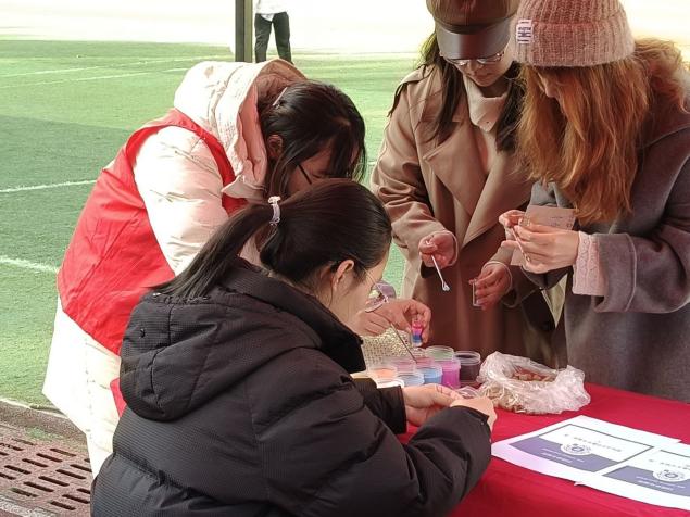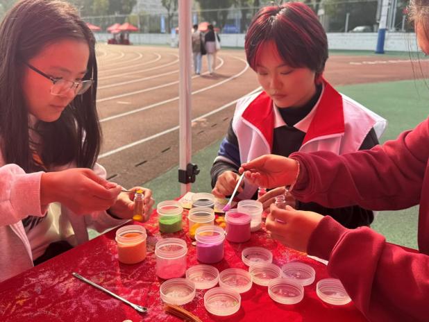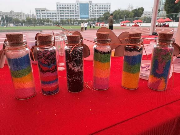娱乐性十足,最受青睐的人气王,非它莫属!彩砂瓶DIY摊位前总是排着长龙,同学们精心挑选着心仪的颜色,小心翼翼地将彩砂层层倾泻入瓶。红的热烈、蓝的沉静、黄的璀璨……层层叠叠,交织成独一无二的艺术品。这不仅是一个手工创作的过程,更是一段专注而治愈的时光。当一个个色彩梦幻的沙瓶在手中诞生,成就感与喜悦溢于言表。这份亲手制作的纪念品,将永远珍藏这份午后的美好。