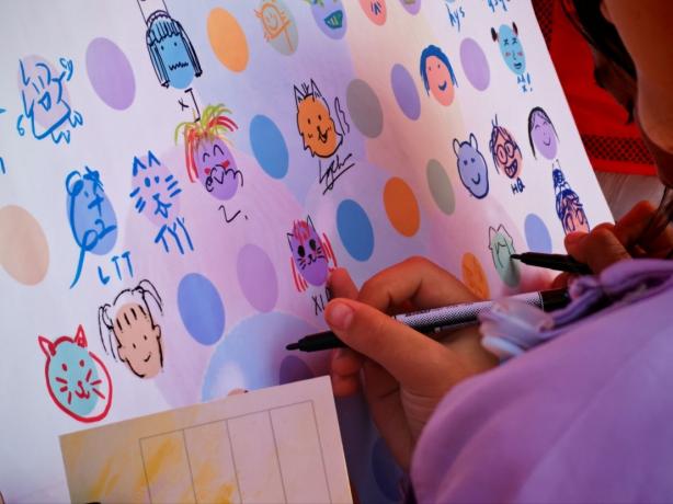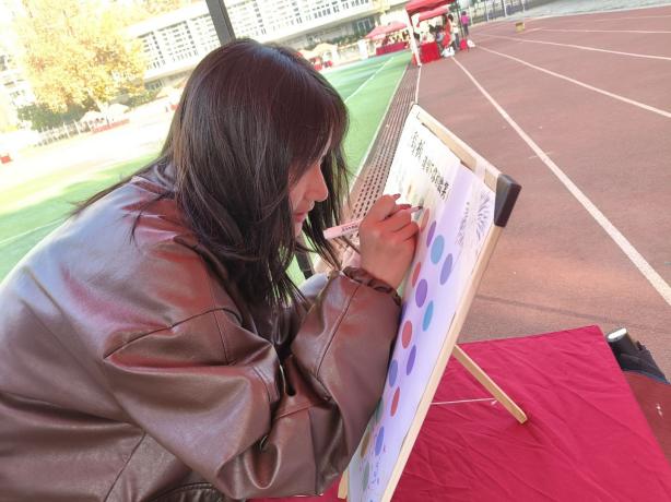 这里不仅是起点,更是情感与创意的交汇处!一块纯白画板,犹如我们共同的青春画布,等待着被赋予色彩与故事。同学们拿起画笔,或写下名字,或绘出卡通形象,或留下风景涂鸦……每一笔涂抹,都是个性的张扬;每一处签名,都是参与的见证。转眼间,画板变得五彩斑斓、生机勃勃,成为凝聚了无数欢笑与友谊的珍贵纪念。它静静地诉说着:这场嘉年华,你我都在场!