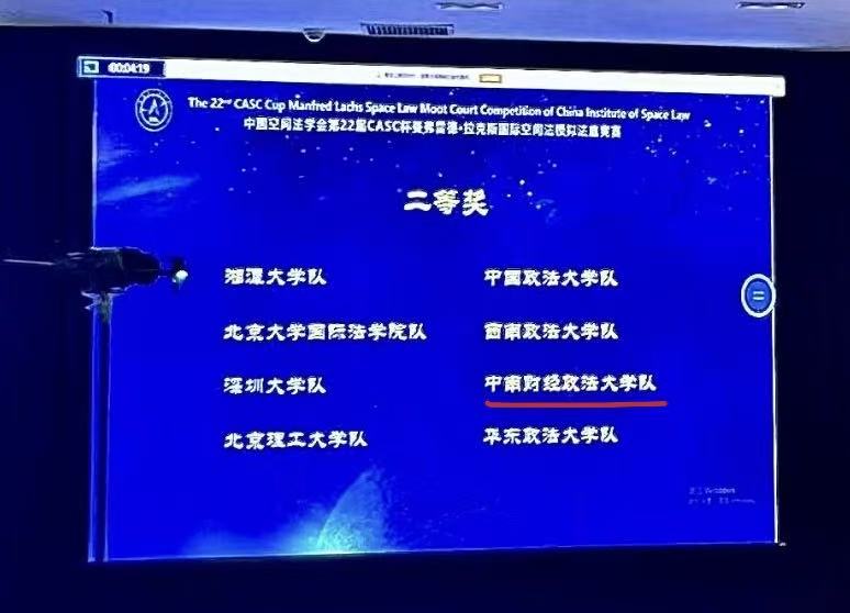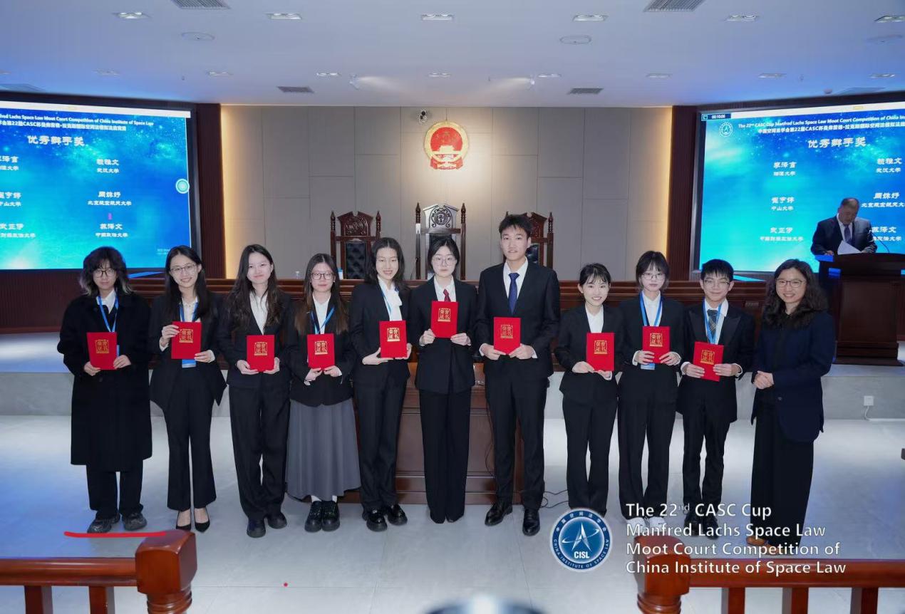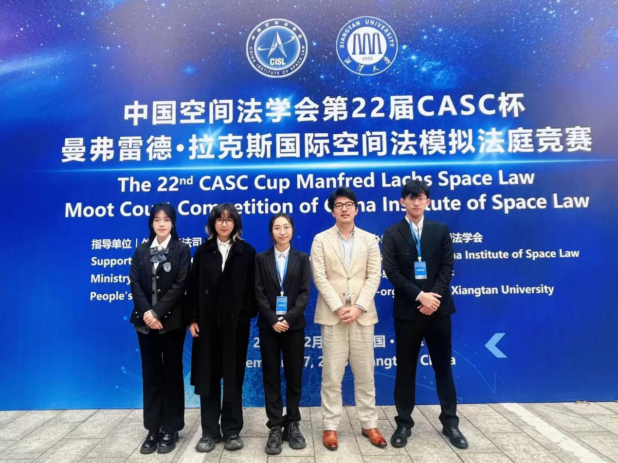 2025年12月6日至7日,由外交部条约法律司指导、中国空间法学会主办、湘潭大学承办的第22届CASC杯Manfred Lachs国际空间法模拟法庭竞赛于湖南湘潭举行。共有来自中南财经政法大学、北京大学、北京航空航天大学、北京理工大学、武汉大学、中国政法大学、华东政法大学、西南政法大学、湘潭大学等全国35所高校的代表队参加了本届竞赛。经激烈角逐,我校代表队荣获全国二等奖,国际法学院武芷伊同学荣获优秀辩手称号。