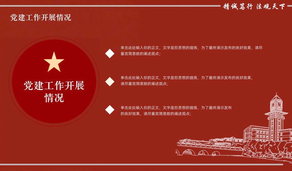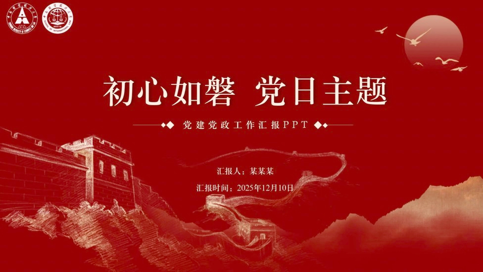 我的作品聚焦“红色与校园”,在设计上深度融合校园特色,将晓南湖畔九孔桥、钟楼、文澜楼等地标融入页面,嵌入校徽、院徽与院训,实现校园文化与红色主题的巧妙契合。同时选用中国传统色朱樱红为主色系,兼顾主题严肃性与美学传播力,既贴合党日活动场景需求,又通过专属校园元素打造独特辨识度,让大家在使用这份PPT时,既能感受到真挚的红色初心,也能体会到属于我们学校的独特情怀。