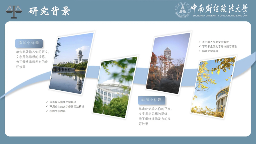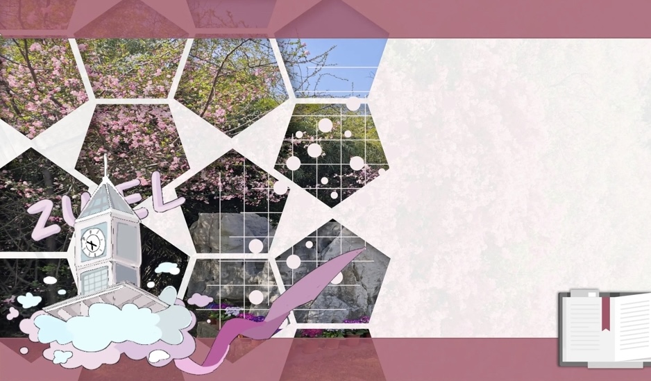 在我设计的ppt模板中,我选取了学校景点作为封面与结束页面,用自然景物衬托浓厚的学术氛围。在图案设计上我结合了文波楼钟楼、我校北门等我校有名的建筑元素以体现学校特色。我想让这份兼具实用性与人文感的设计,成为学术表达的有力载体,用简洁大方的版式助力学术观点的清晰传递,同时以校园景致唤醒师生的归属感与认同感。