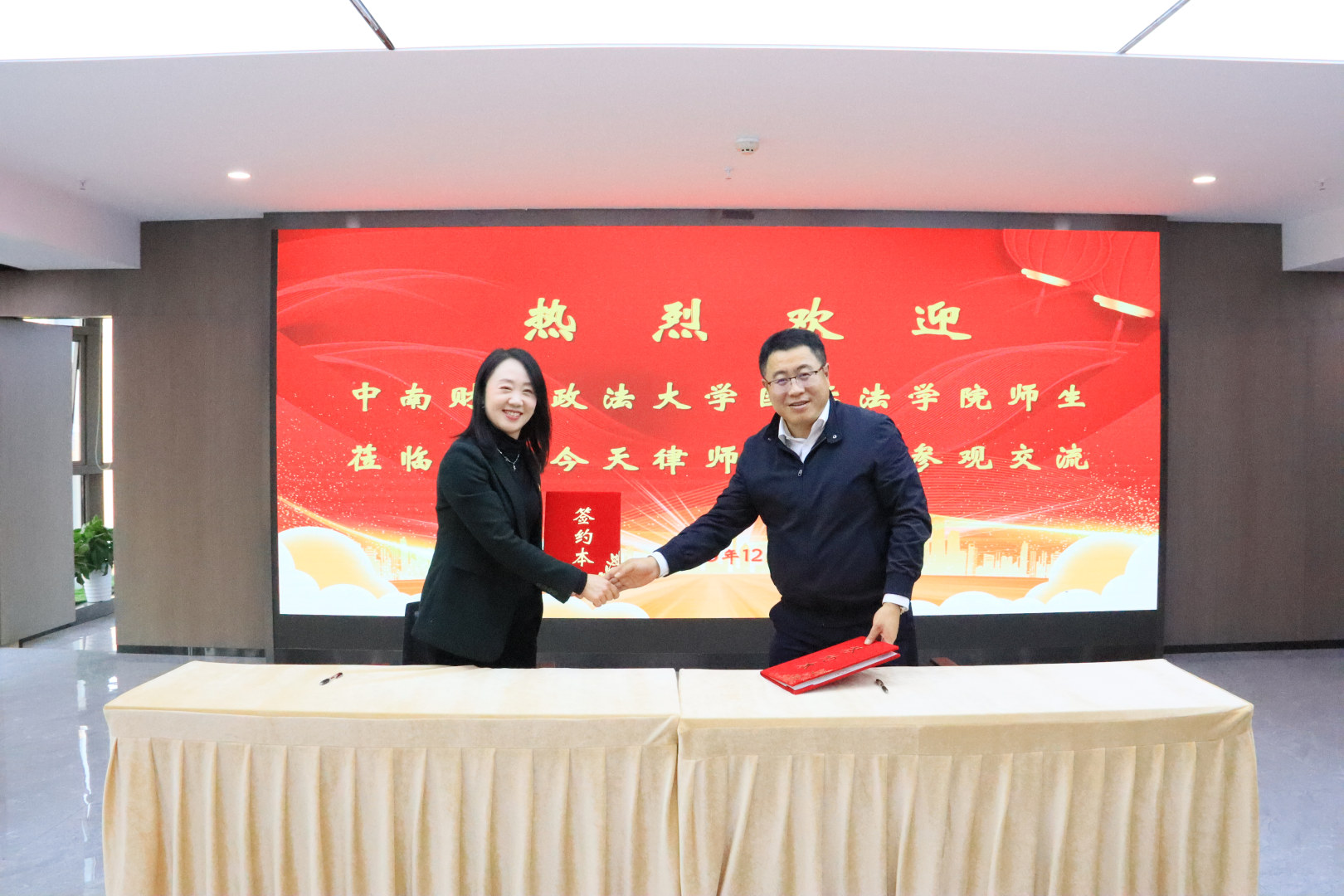 12月18日,国际法学院“励青春·航线探索”律所研学营暨实习基地挂牌签约活动在湖北今天律师事务所举行。本次活动以党建为引领,紧扣“立德树人”根本任务,搭建产学研实践育人平台,助力国际法学子未来发展。湖北今天律师事务所党委书记、管理合伙人赵力国,涉外事务部部长刘洋,涉外事务部部员华宇凡、高颂扬,国际法学院党委书记万莉,学办主任董星仙、辅导员王智健以及四十余名国际法学子参加活动。活动由刘洋律师主持。