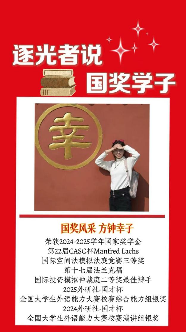 寄语:法学专业学习从无捷径,愿师弟师妹们尽快适应专业节奏,找到适配自己的学习方法,发掘热爱且愿意深耕的方向。眼下的艰辛皆为铺垫,一切付出都值得。未获国奖的同学不必灰心,踏实规划、认真做事,终会有所收获。同时也愿大家在奋进路上不忘好好生活,以健康饱满的状态奔赴未知与未来。