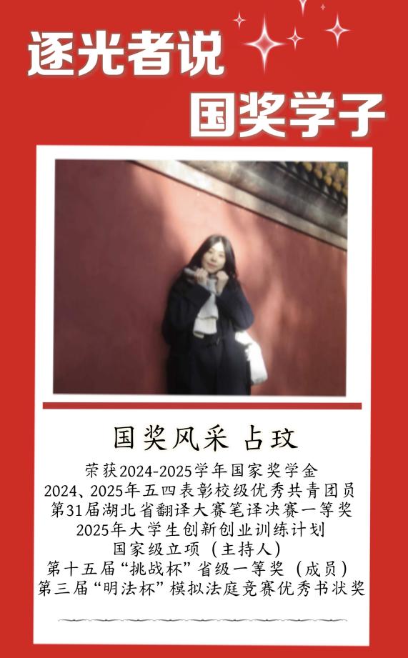 世事多变、前路未知,是大学的常态,而唯有守住内心的恒定,方能行稳致远。外法2301班的占玟,以“命运无常,我有常”为人生信条,在学业与成长的诸多变数里,搭建专属精神内核,将外界指标化为内在秩序,在自洽与坚定中稳步前行,终捧得国奖荣誉,走出独属于自己的精彩之路。